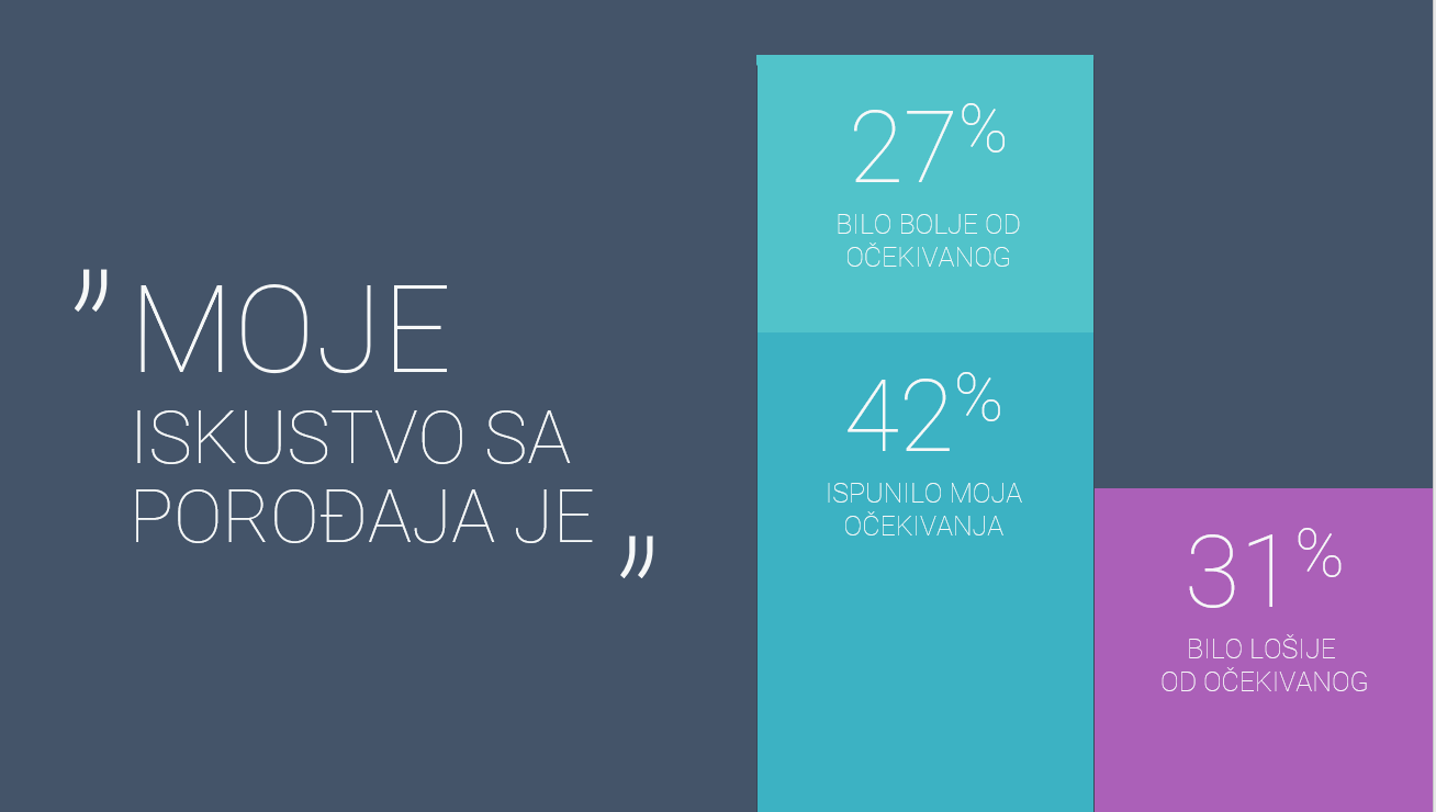Ipak, istraživanje je pokazalo da je u čak 70% slučajeva iskustvo u porodilištu ispunilo očekivanja mama ili je čak bilo i bolje od očekivanog. Ukupna ocena koju su mame dale porodilištima je 3, 54 što bi značilo da su naša porodilišta jedva vrlo dobra.