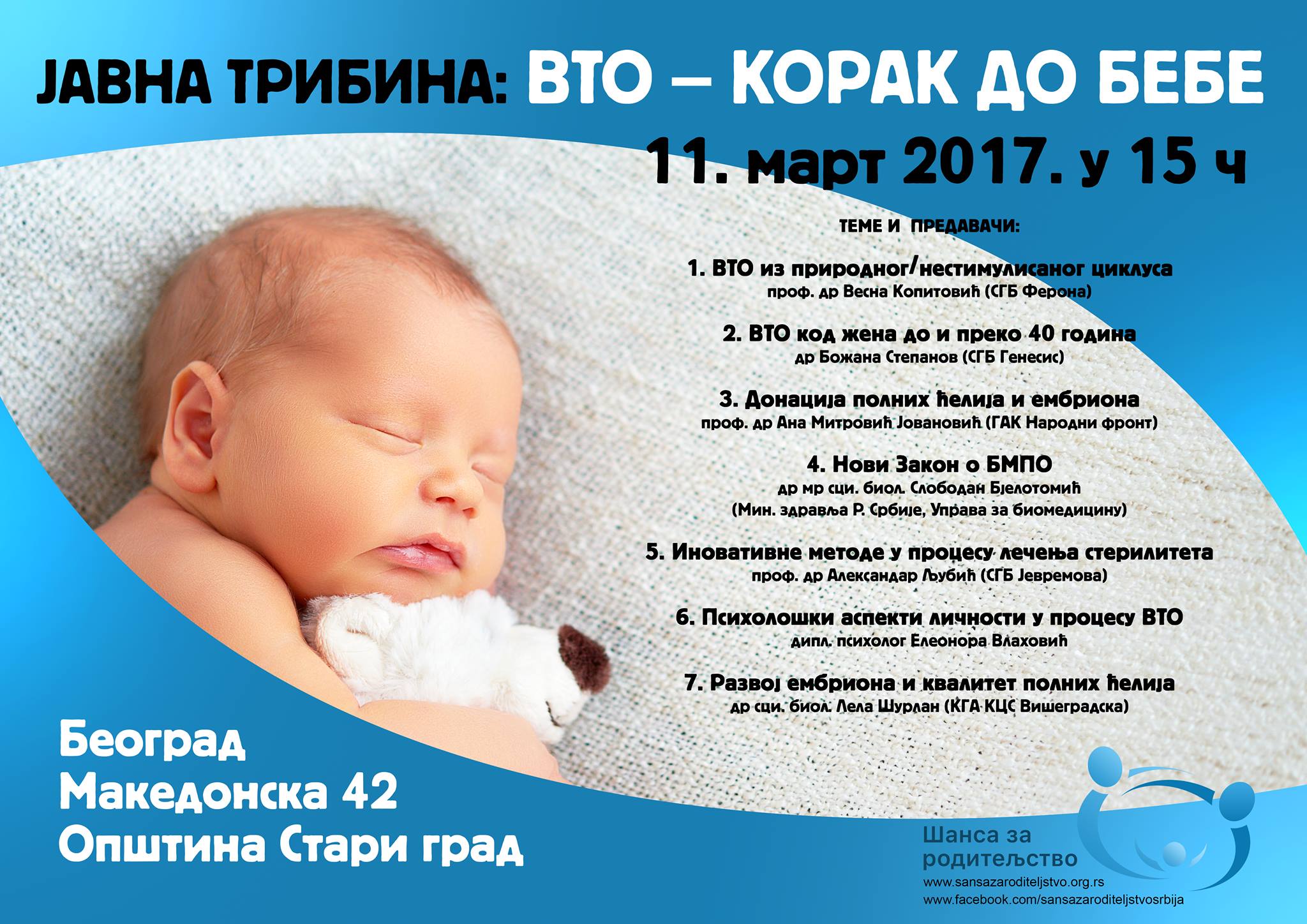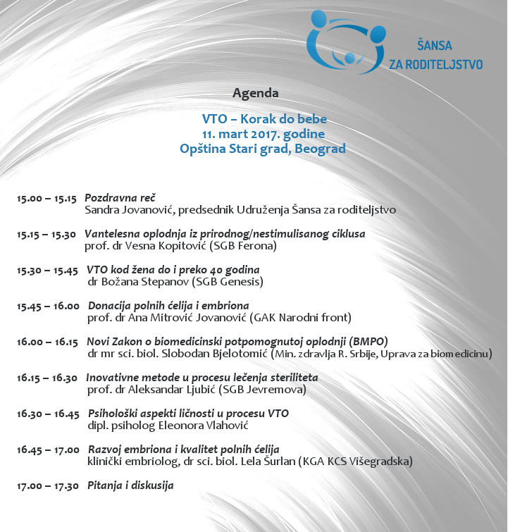 Kao deo dugoročne strategije, Udruženje će 11. marta 2017. godine u 15h, u Opštini Stari grad u Beogradu, organizovati javnu tribinu pod nazivom: „VTO – Korak do bebe”.